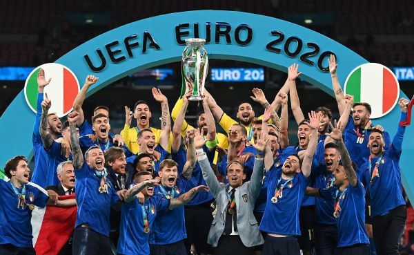 2021年7月11日,在2020年欧洲杯决赛中,意大利队战胜英格兰队夺得冠军。图为意大利队球员庆祝夺冠。新华社欧新