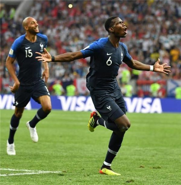 2018年7月15日,在2018年俄罗斯世界杯决赛中,法国队球员博格巴庆祝进球。新华社记者李尕摄