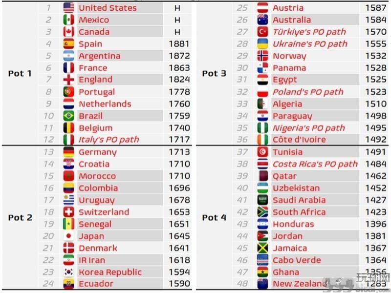 明年的世界杯将有48支参赛队伍,分为12个小组,每组4支球队。每组前两名以及成绩最好的8支第三名球队将晋级32强。因此,如何划分小组档次,成为各方关注的焦点,毕竟这将决定每支球队在小组赛阶段会遇到哪些对手。 所有晋级的球队,除了三个东道主的分组已定外,其他球队将按照国际足联最新的排名进行分档,分为四个档次,每个档次包含12支球队,这四个档次分别对应小组中的四个位置。然而,根据数据机构Football Meets Data的披露,国际足联并没有明确规定附加赛晋级的球队应该如何分档,似乎在这方面留有一些空间。
